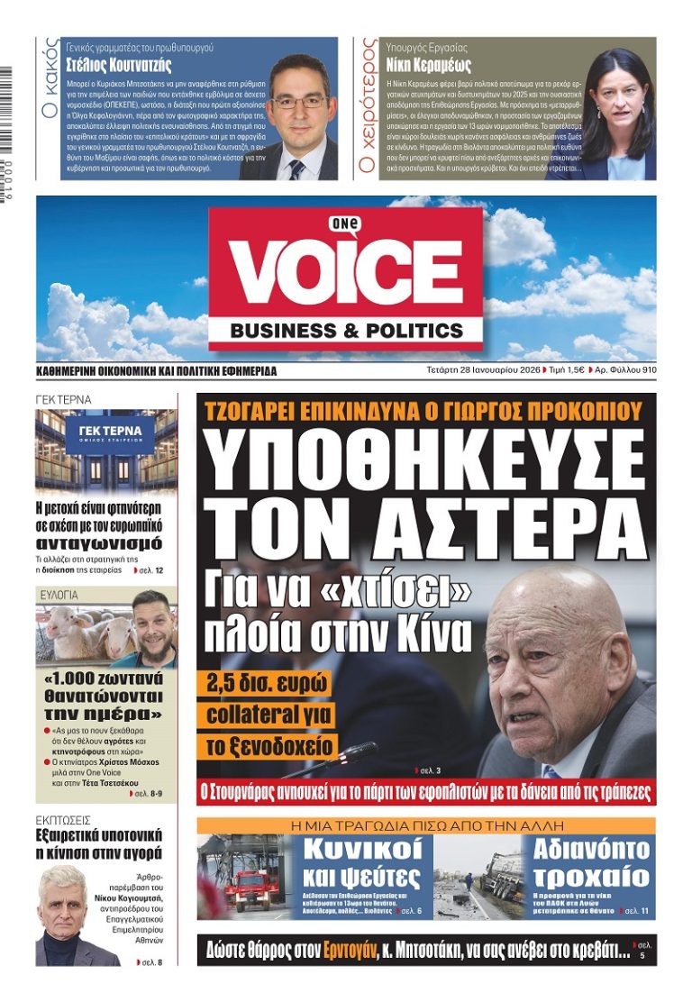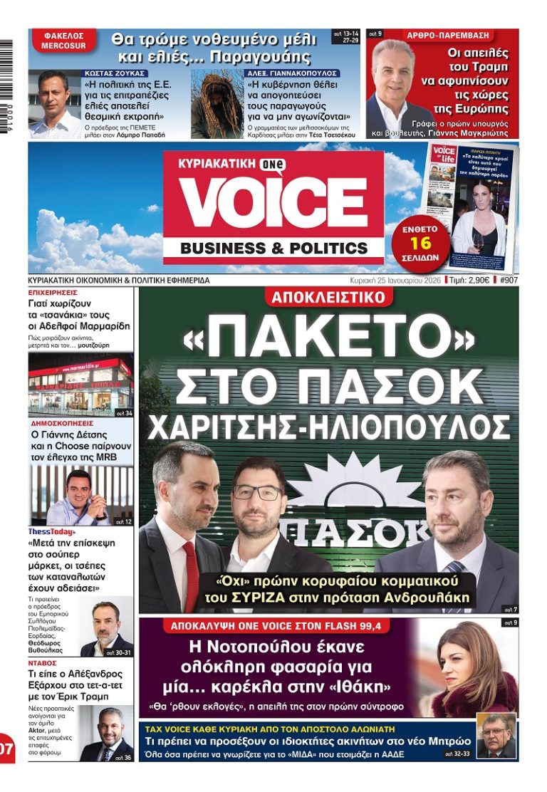 Κυκλοφορεί την Κυριακή 25 Ιανουαρίου το νέο φύλλο της Κυριακάτικης One Voice. Πρωτοσέλιδο θέμα αυτή την εβδομάδα «Αποκλειστικό: “Πακέτο” στο ΠΑΣΟΚ Χαρίτσης- Ηλιόπουλος». «Όχι»…