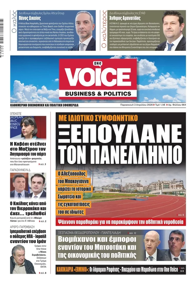 Μη χάσετε σήμερα το νέο φύλλο της καθημερινής One Voice. Πρωτοσέλιδο θέμα «Με ιδιωτικό συμφωνητικό: Ξεπουλάνε..