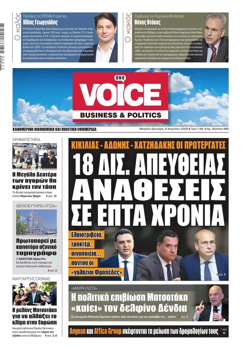 Μη χάσετε σήμερα το νέο φύλλο της καθημερινής One Voice. Πρωτοσέλιδο θέμα «18 δισ. απευθείας αναθέσεις..