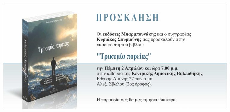 Το βιβλίο του Κυριάκου Σπυριούνη, Αντιστρατήγου ε.α. και πρώην Βουλευτή, με τίτλο «Τρικυμία Πορείας», θα παρουσιαστεί..