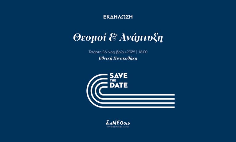 Η διαΝΕΟσις διοργανώνει δημόσια εκδήλωση με τίτλο “Θεσμοί και Ανάπτυξη“, την Τετάρτη 26 Νοεμβρίου 2025 στις 18:00 στην Εθνική Πινακοθήκη, αμφιθέατρο “Ίδρυμα Ωνάση” (Βασ...